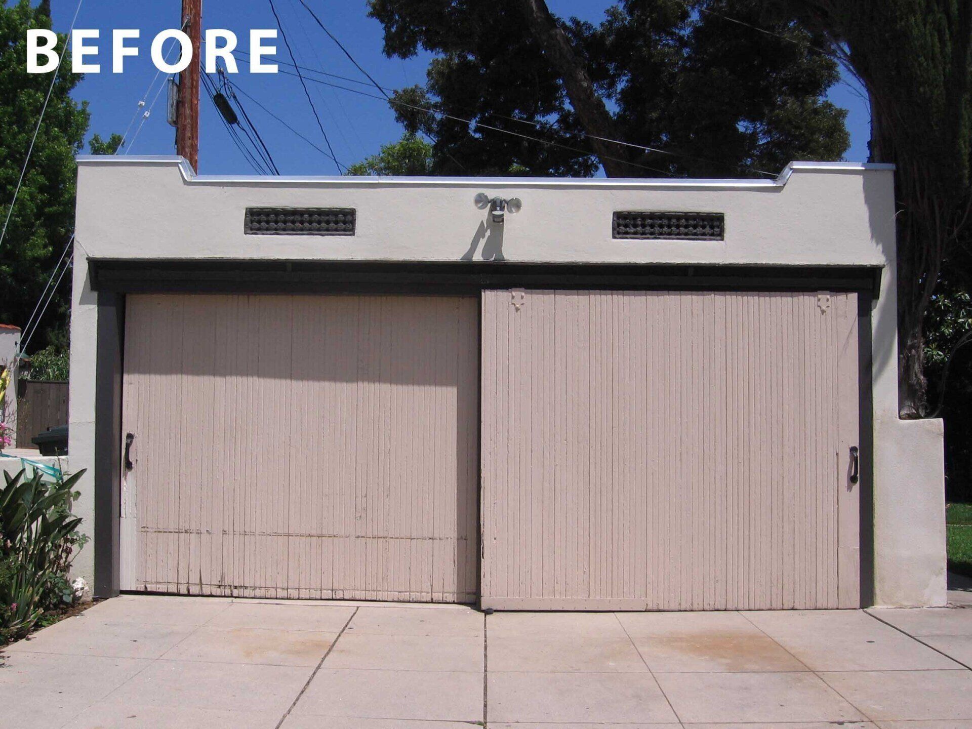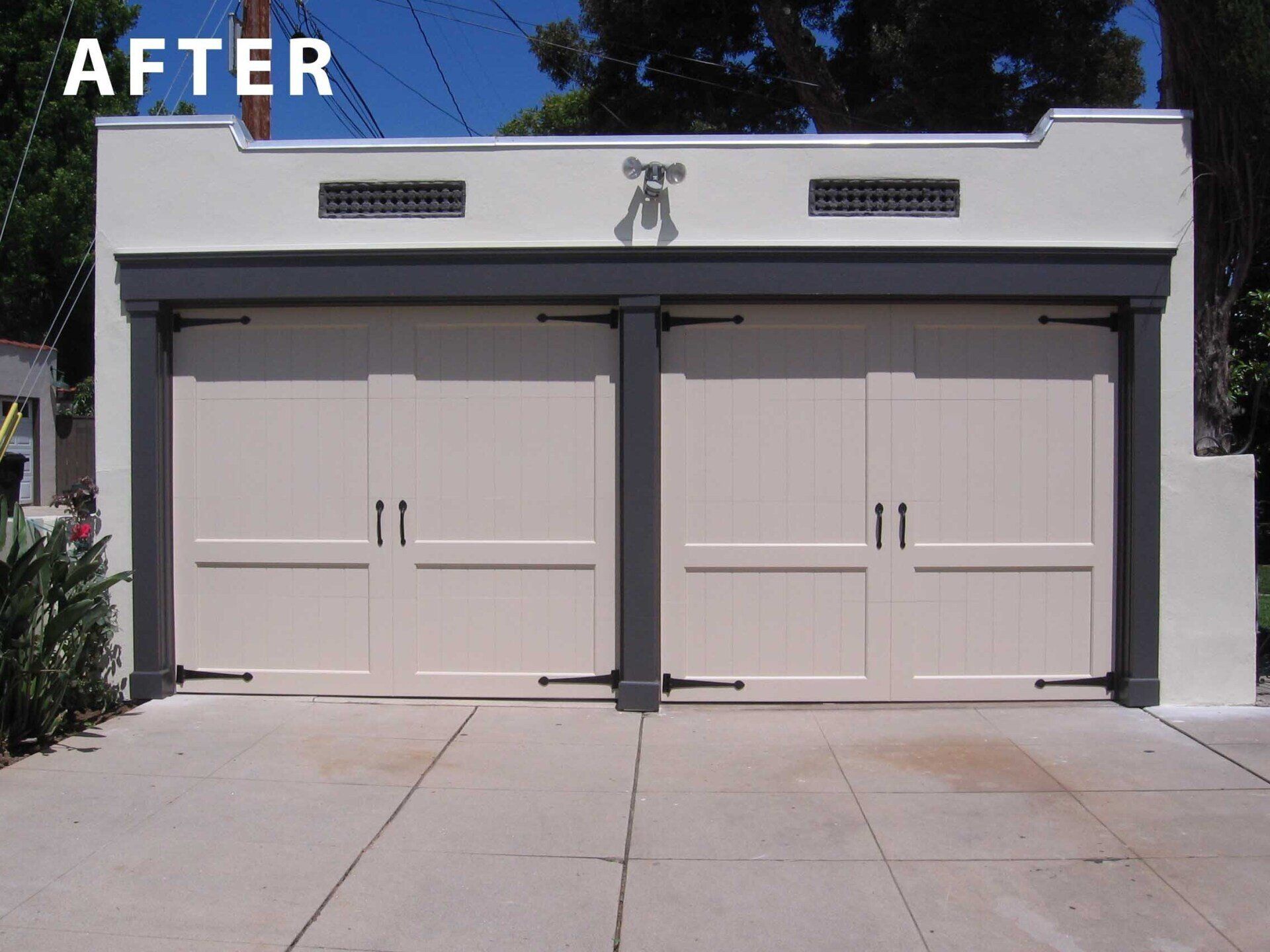 I removed the old doors completely, widened the center post, added a beam above and installed new door jambs with trim. The new garage doors are wood, insulated sectional doors made to look like out-swing double doors. Garage door openers were installed per the owners request. The result is a modern working garage door system that looks exactly like the period of the home.